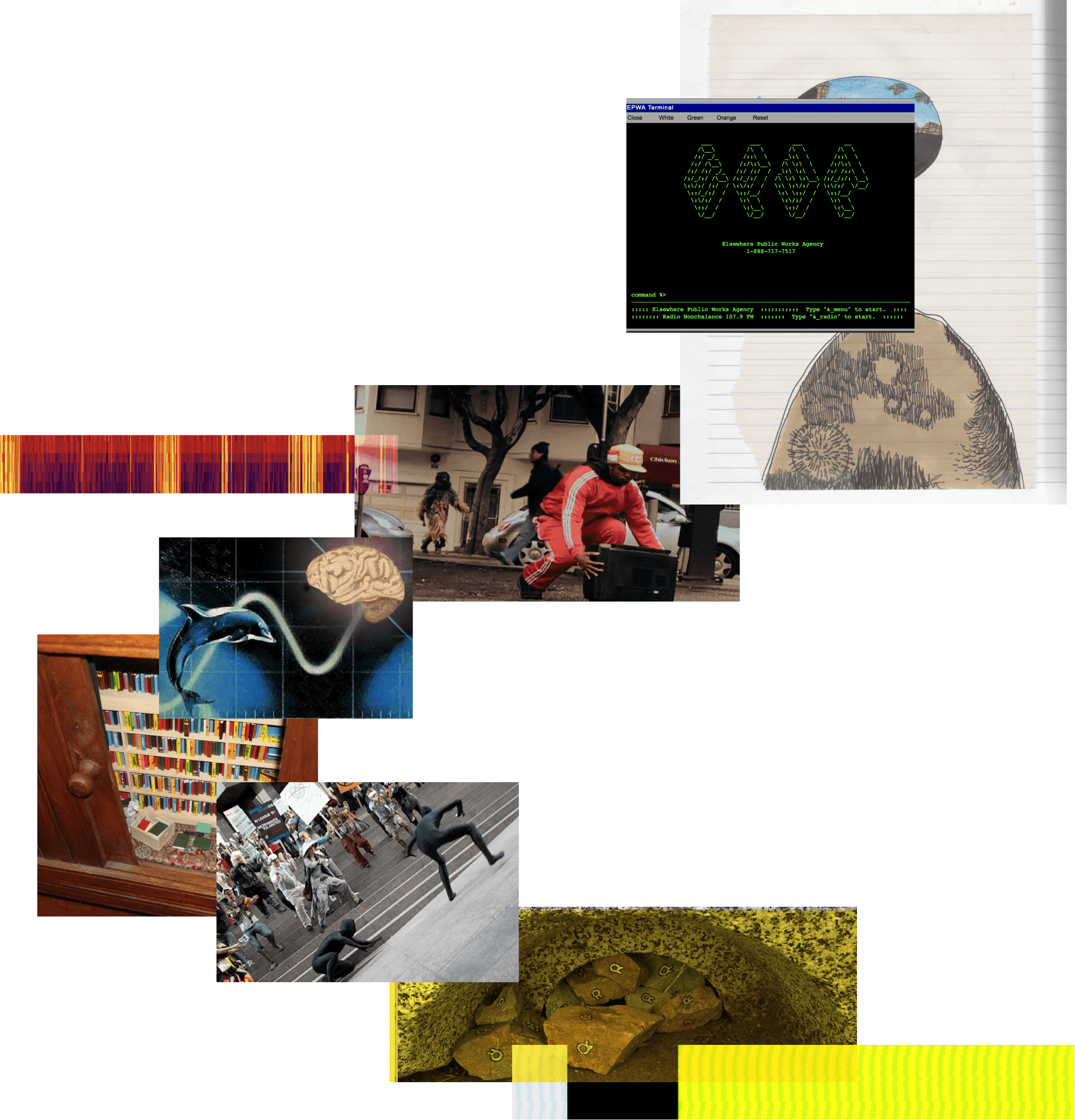Nonchalance guides patrons to investigate a future that not only rejects a mundane workaday life, but --in a major jump from where the Situationists left off -- enter into a state of nonchalance. The path to nonchalance is signified by the leisurely pursuit of EPWA’s fictitious utopia, Elsewhere.