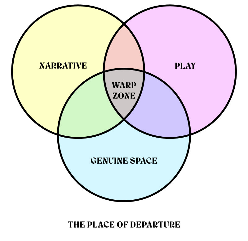 The participatory arts of Nonchalance is situated at the intersection of three core elements; Narrative, Genuine Space, and Play. When these elements intersect, a warp zone is revealed. This place of departure is where transformation becomes possible.